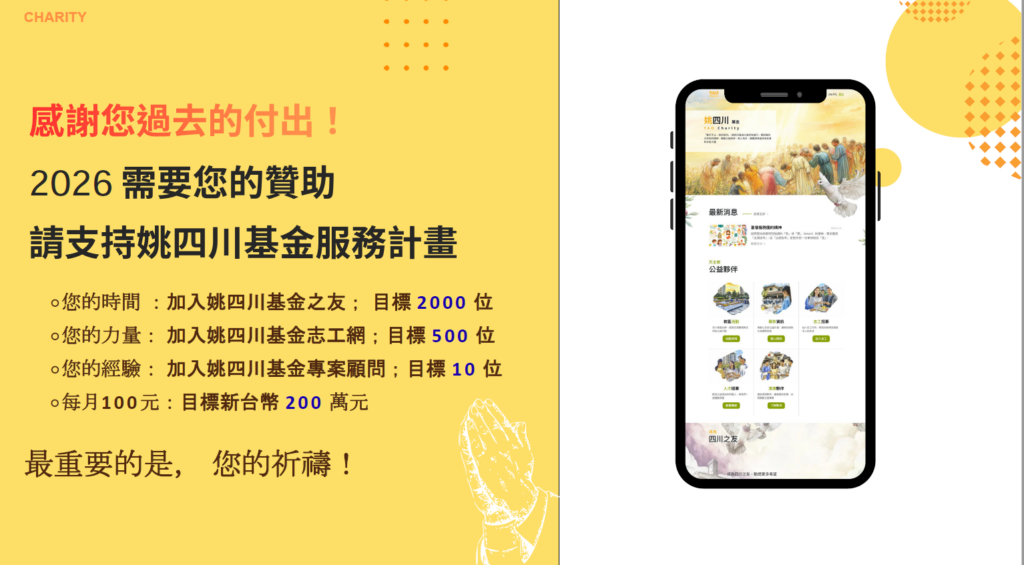 感謝您過去的付出,請支持姚四川基金服務計劃