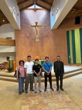 正宇哥及麗琴姐帶我們到 Saint Timothy Catholic Church 參觀他們家附近的教堂,這個堂區在神父的介紹下我們清楚的知道它是屬於 2000 多個家庭的教堂,可見它在這個地區是有一定的程度的影響力,之後神父帶我們稍後認識一下堂區內的建築,有趣的是會議室的旁邊就是廚房,給他們一個很舒適的空間,我們遇到了很多在這工作的志工,他們非常歡迎我們到這座教堂參觀,最後我們參觀了教堂內的告解室、神父的更衣室及休息區。教堂參觀結束後我們來到了麗琴姐家稍作休息,與我們分享服務團的半世紀的回顧影片,以及新版大風歌的由來。